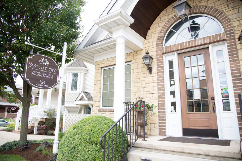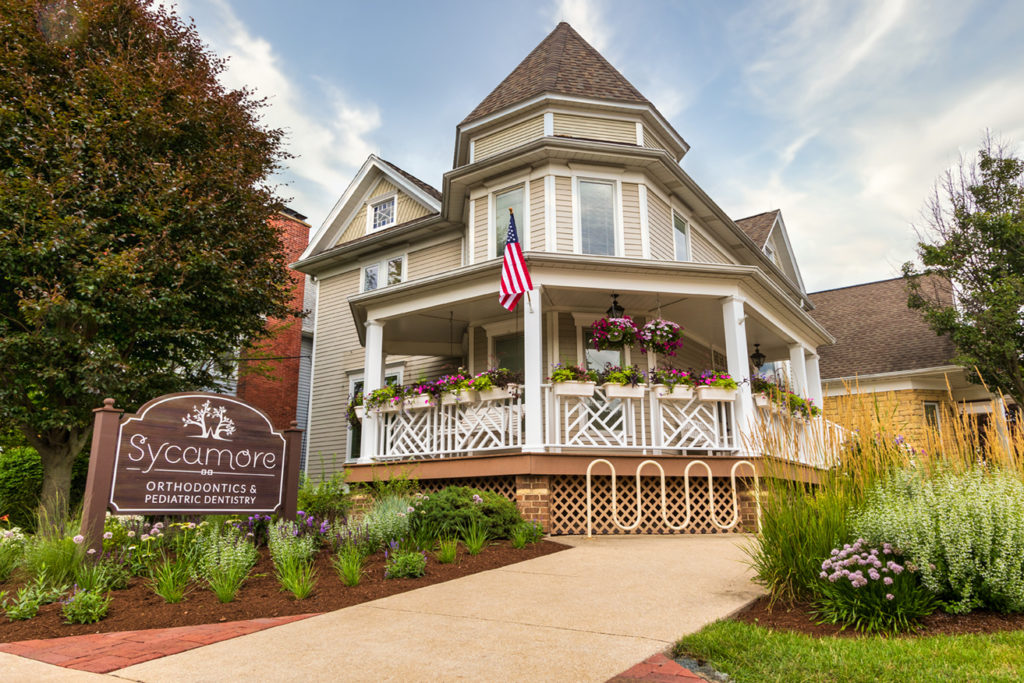 Historic building of Sycamore Orthodontics & Pediatric Dentistry with welcoming porch, flowers, and signage, located in Dekalb, Illinois.
